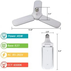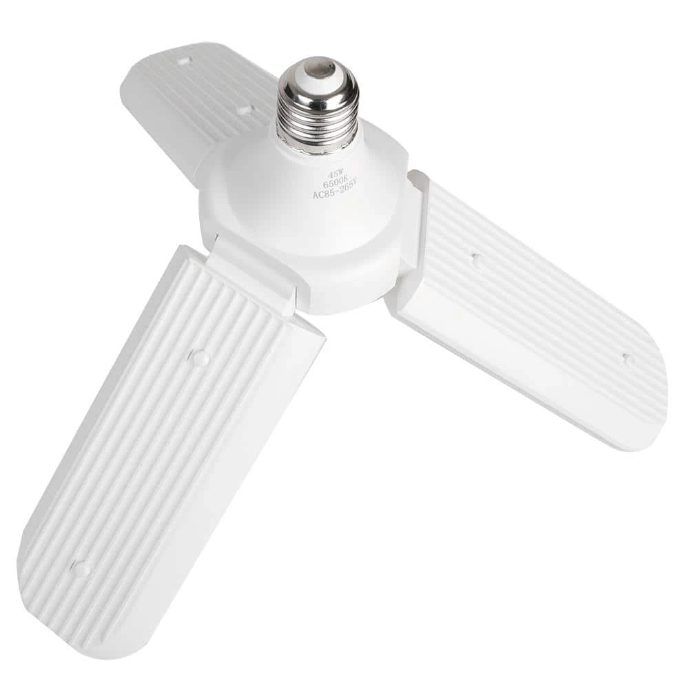 This super bright LED garage shop light features LED technology with top quality diodes that total 6000 Lumens, power 45-Watt, 7000K daylight for your garage, providing the best indoor lighting experience. The garage Lights has 3 LED panel heads can be adjusted, each light head can be folded up to 90ยฐ. The maximum coverage angle can reach 360ยฐ, which will make the light cover a wide area. It is the perfect choice for indoor using for garages, basements, workshops, utility and recreation rooms, storage rooms, barn, equipment rooms, large area lighting requirements, industrial workstations, workspace, carports, auto shops.