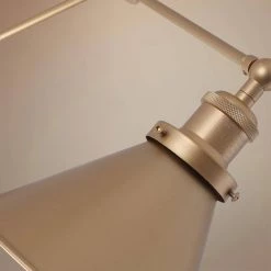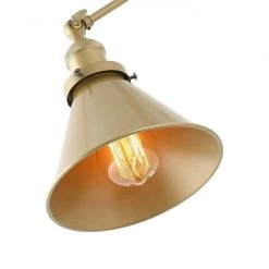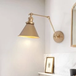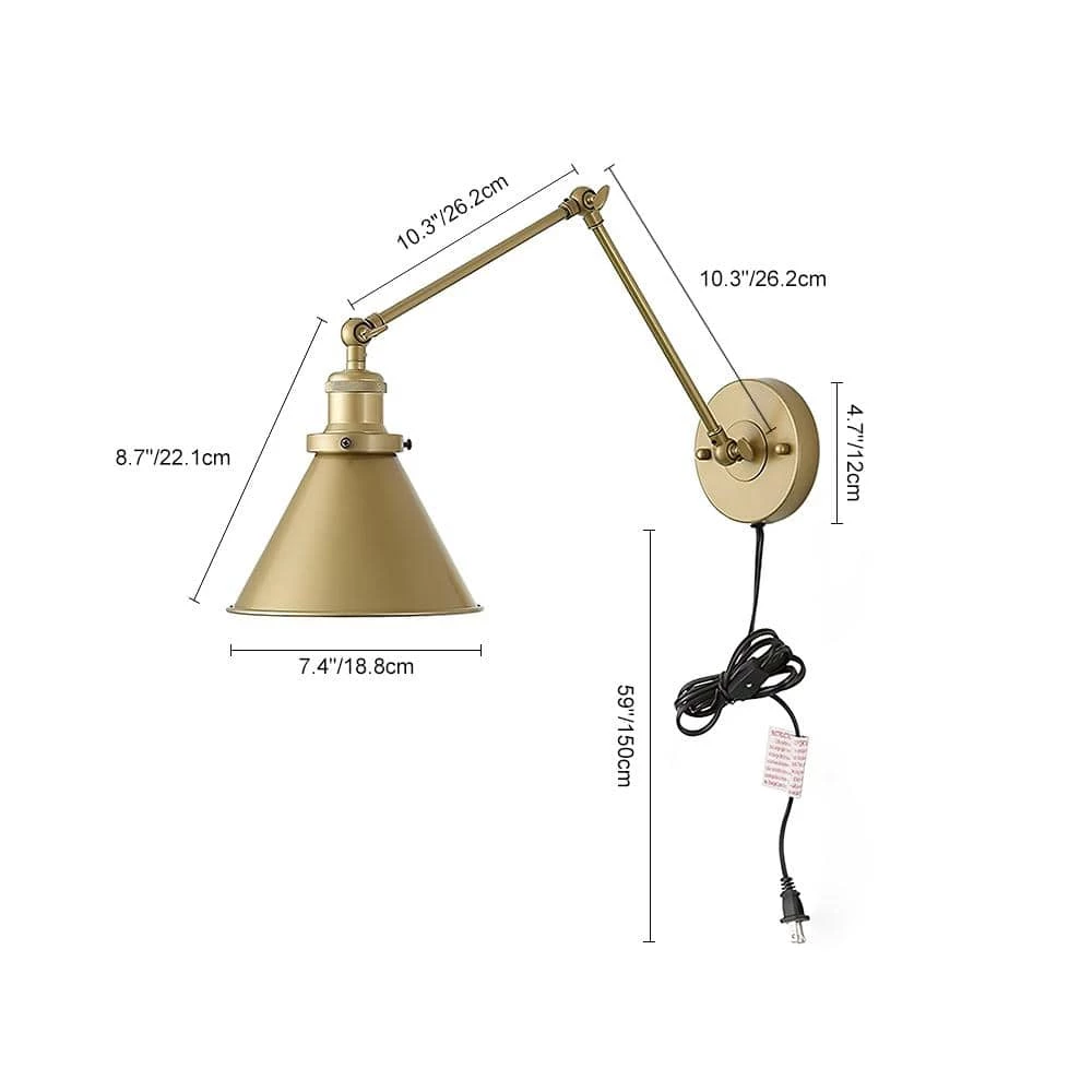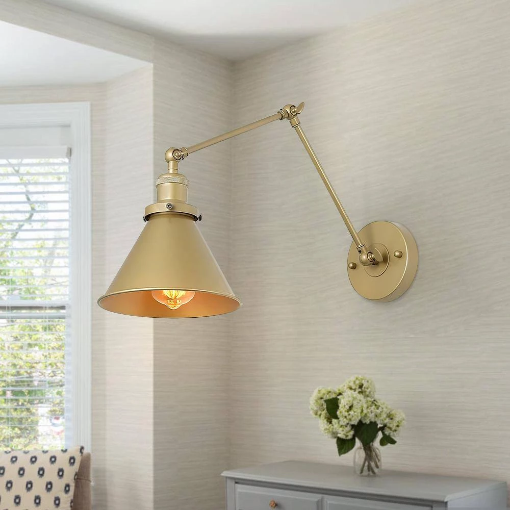 The Swing Arm Wall Sconce has a vintage task light silhouette that will mix with an industrial or modern theme over your desk, beside your bed, or behind the couch for brightness and style. Leave it as a plug-in to move it easily and create different looks in different rooms or hardwire it to your wall for a long-lasting look. Crafted of sturdy metal and painted with the classic gold accents, plus the retro bell-styled lampshade, offering both function and style to your home, office, or commercial space.