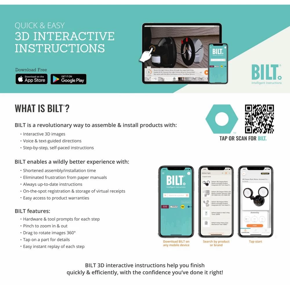 The New Defiant 180ยฐ LED motion security light chases away nighttime darkness. This LED motion light provides seamless light coverage for increased safety, security and peace of mind. Never change a bulb again with this new LED technology. Install quickly and safely with 3 friendly, DIY easy steps to connect.