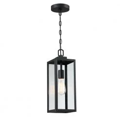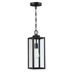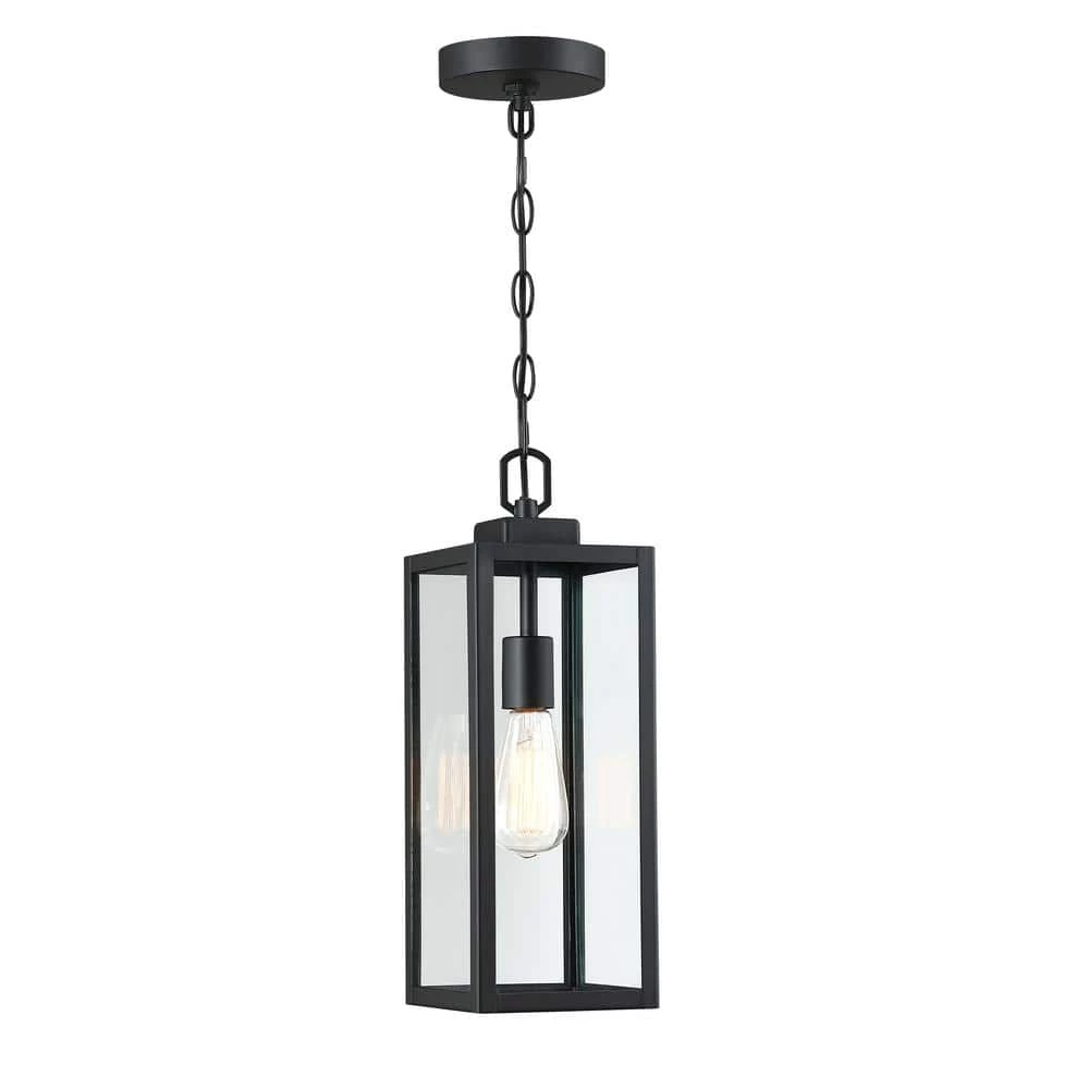 The fully crafted hanging lantern with matte black finish and clear glass shade adds a sense of modern-inspired flair to the exterior of your home. With 4 clear glass panels assembled, it showcases how a modern hanging lantern looks like. Its also workable for dry, or even damp environments. This beautiful hanging lantern is totally safe to use under covered porch, patio, or veranda. The 1-light hanging lantern accommodates for 1 medium-base bulb of up to 60-Watt (bulb not included) that disperse ambient light to warm up the exterior of your home. An adjustable length of chain with a matching canopy above to round out the design.