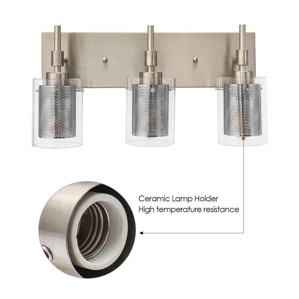 The vanity light is designed in refined and contemporary style on the wall when lighting to create a touch of brilliance to your residence. Built-in a sturdy metal lamp body with a handsome brushed nickel finish and transparent glass shades, the Vanity Light will bring more exquisite and luxurious for your home lighting. A perfect choice for the top side of your bathroom mirror or bed, a doorway or entryway, lining an office or hotel hallway, under a covered porch or patio.