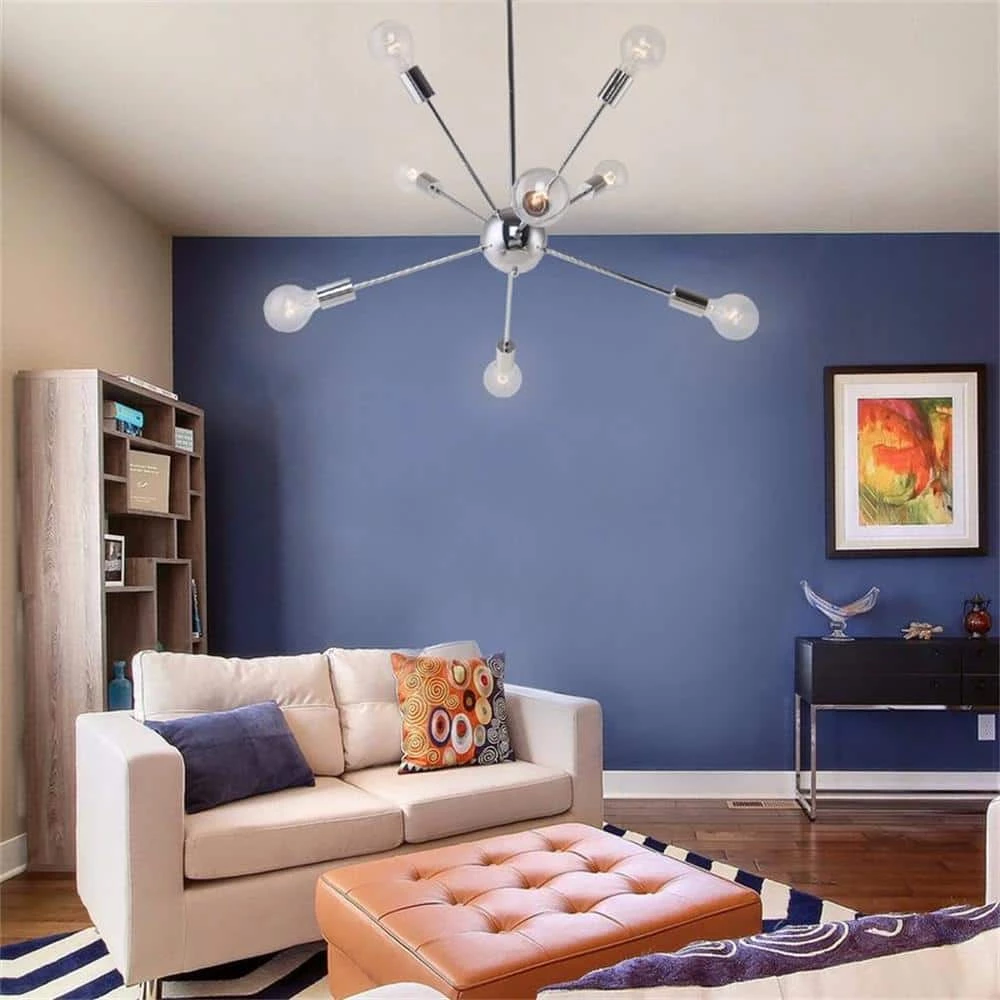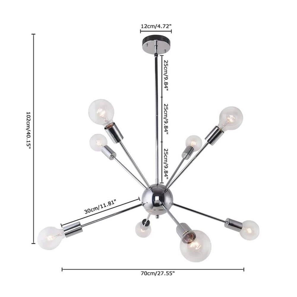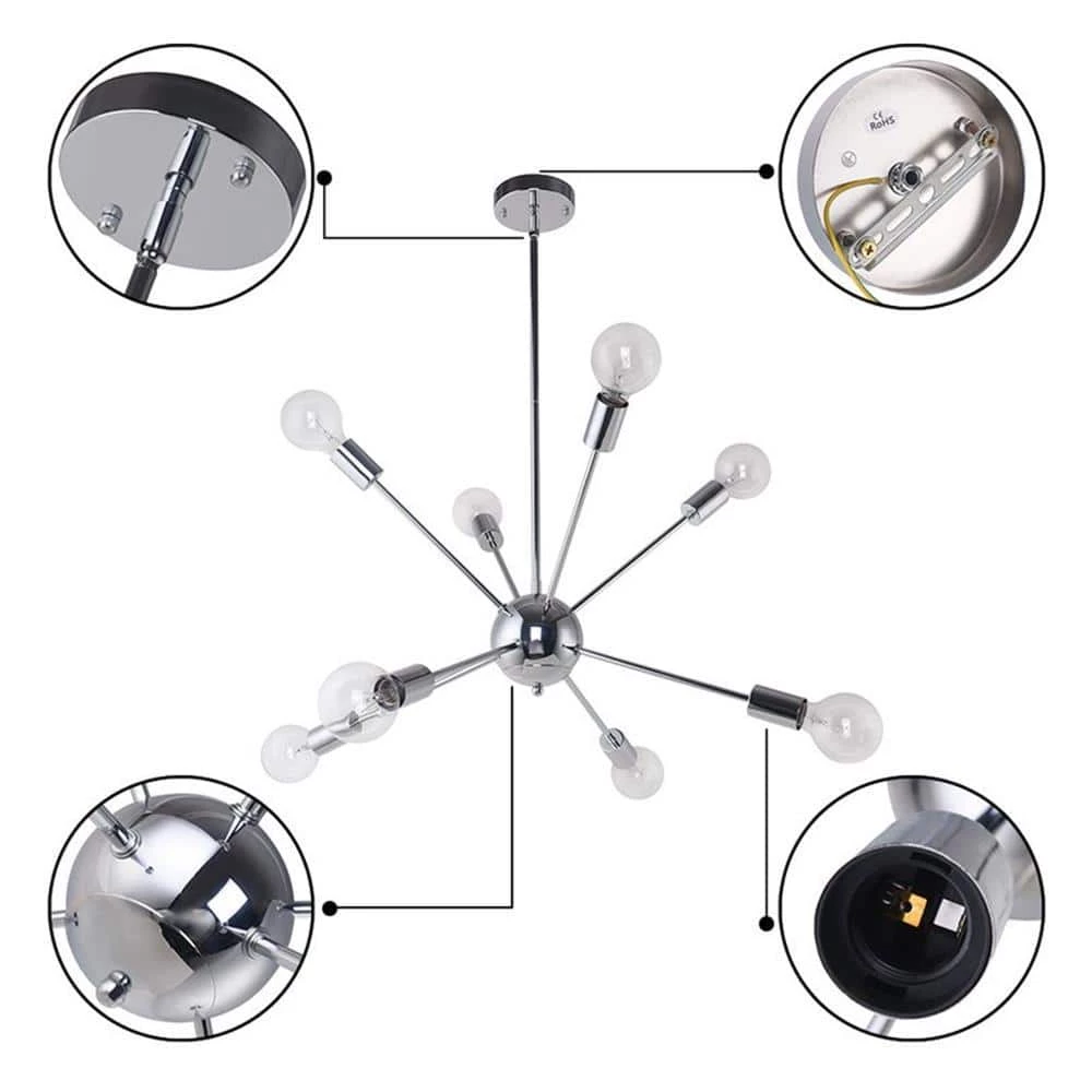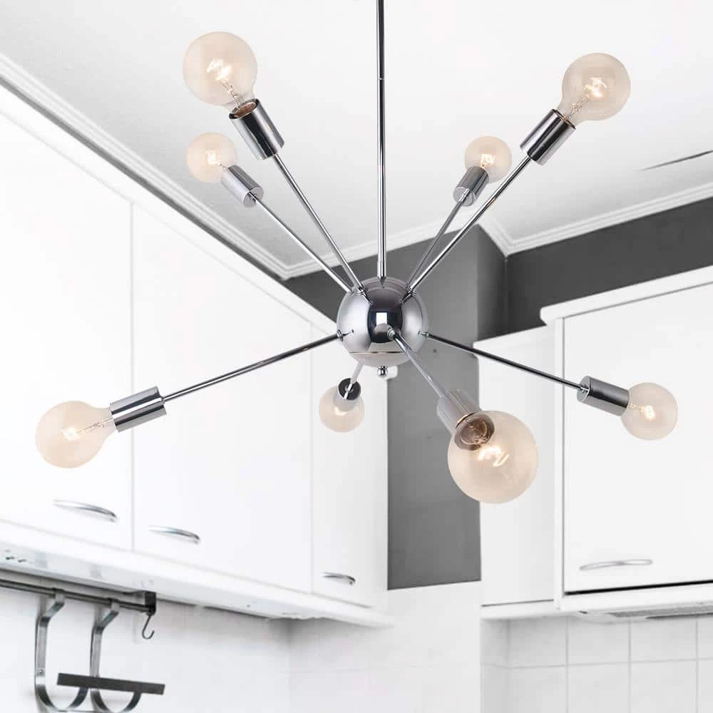 Featuring a striking sputnik silhouette, this modern sputnik chandelier will never be out of fashion. This mid-century ceiling light’s 8 arms stretch from the metallic core for an explosive, dynamic look, bringing space-age style to any space and complimenting room decors from contemporary minimalist to rustic farmhouse. With its trendy look and natural chrome finish, the chandelier is ideal for use in your living room or dining room.