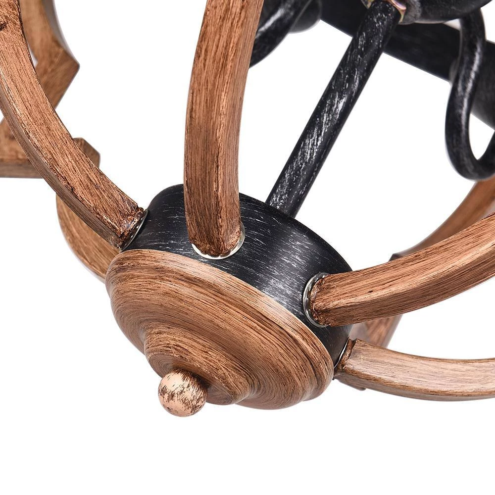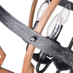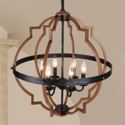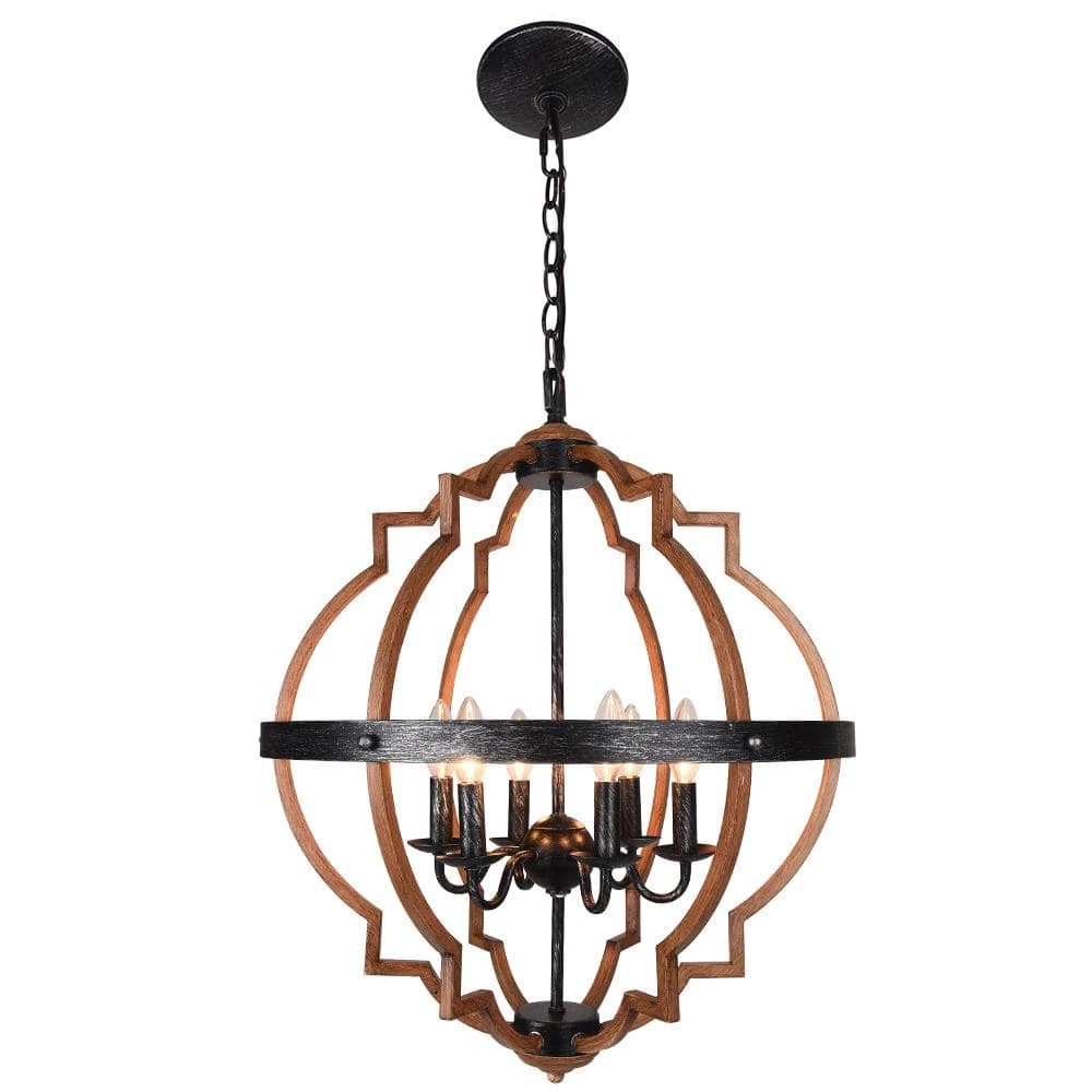 The frame features an open design and is complemented with a dark brown finish and painted antique wood iron accents. Designed to be displayed singularly or in groups of 2 or more in a variety of areas these fixtures are suitable over kitchen islands, dining room tables, entryways and foyers and more. A matching round ceiling canopy is included and allows for this chandelier to hang from a sloped ceiling.