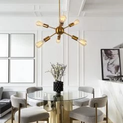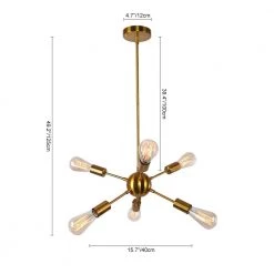With an attractive sputnik-inspired silhouette, this Sputnik Chandelier adds an impressive dynamic to any modern or mid-century styled space. Decorated by crossing rods with bright round bulbs at each end, This Farmhouse Sputnik Chandelier leaves warm impressions with its natural brass finish. Boasting a sloped ceiling-compatible canopy and adjustable hanging down rod, this sputnik chandelier is versatile light to be used in living rooms, dining rooms, and bedrooms.