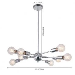 This Sputnik Chandelier adds an impressive dynamic to any modern or mid-century styled space with an attractive sputnik-inspired silhouette. Decorated by crossing rods with bright round bulbs at each end, This Farmhouse Sputnik Chandelier leaves warm impressions with its natural chrome finish. Boasting a sloped ceiling-compatible canopy and adjustable hanging down rod, this sputnik chandelier is a versatile light to be used in living rooms, dining rooms, and bedrooms.