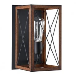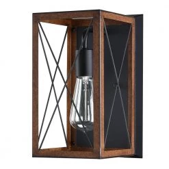 The 1-light Wall Lantern Sconce with Matte black and Barnwood accents creates a sense of classic barn-like that feels relaxation and convenience at home. The fixture with steel cage design features a faux-wood accents with a rich painted finish. The design of X-cage stretches across each side of the frame with farmhouse style reminds us the past of old barn doors and rustic gate in country farmhouse. The 1-light Lantern Sconce ideals for any hallway, kitchen, living room, bedroom in your home. It also ideals for real farmhouse, rustic, industrial. with 1 incandescent bulbs of up to 60-Watt ceil inside the cage (Bulbs are not included). Mount this classic farmhouse indoor wall light to warm up your home.