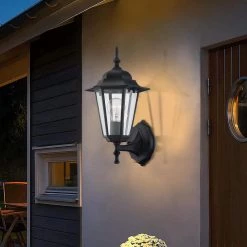 - Outdoor wall lantern sconce with clear glass shade, and beautiful matte black finish, bring convenience and relaxation to your life on exterior of your home