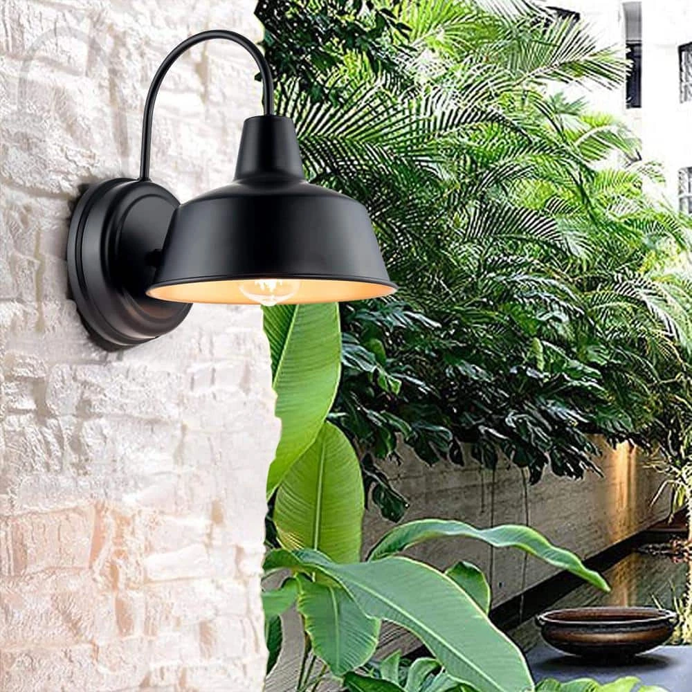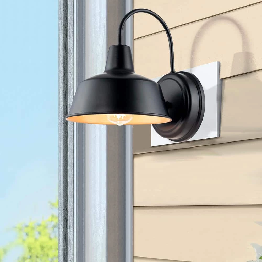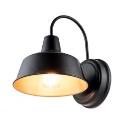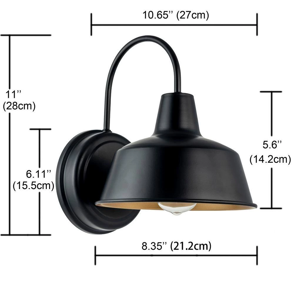 The 1-Light Barn Light Sconce with Bronze finish with Gold-Painting inside Illuminates your outdoor space in farmhouse, rustic and industrial style. The design of revrse rounding metal wok adds a touch of traditional ambiance in farmhouse style reminds us the past of old barn doors and rustic gate in country farmhouse. The Barn Light workable for dry, or even damp environments. This beautiful wall light is totally safe to use under covered porch, patio, or veranda. The 1-light lantern sconce accommodates for 1 medium-base bulb of up to 60-Watt (bulb not included) that disperse ambient light to warm up the exterior of your home.