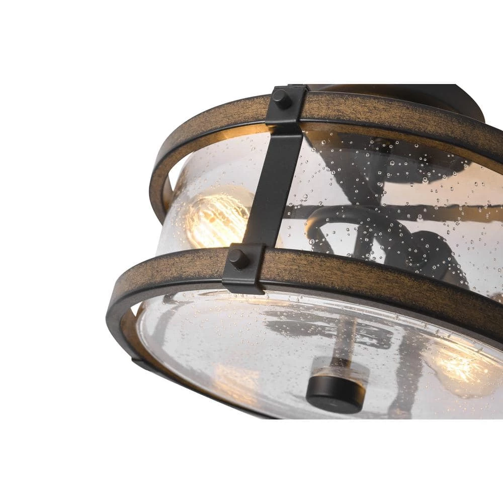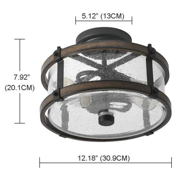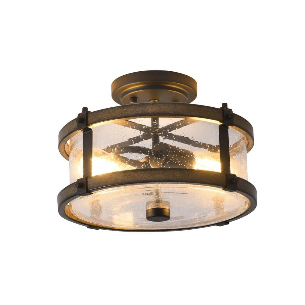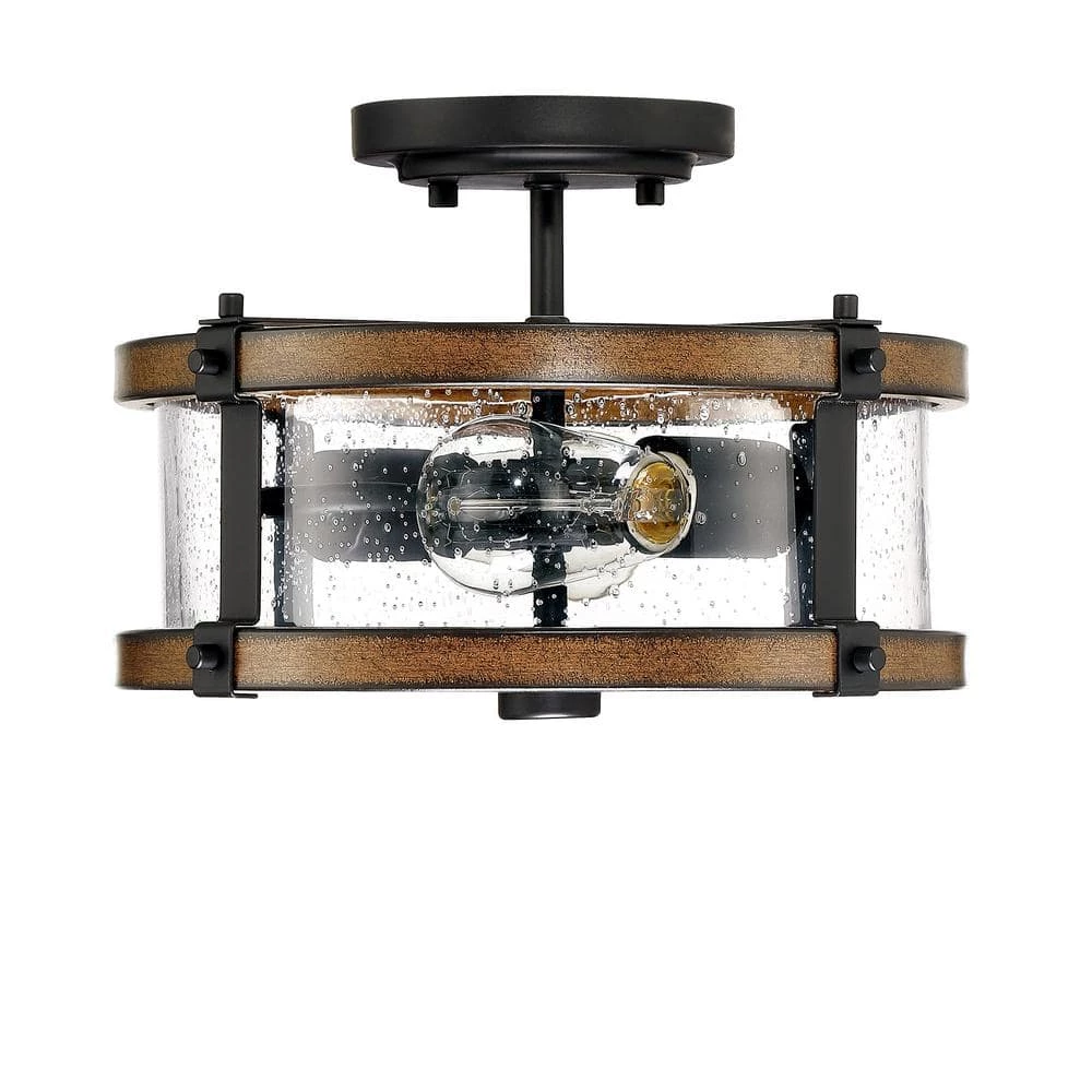 - Charming 2-light semi flush mount with matte black and barnwood accents and seeded glass brings convenience and relaxation to your life