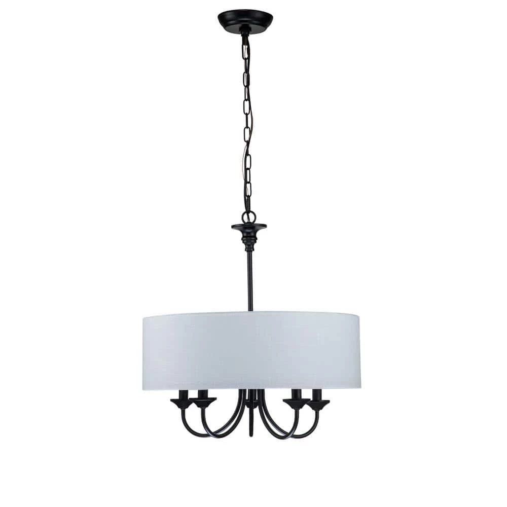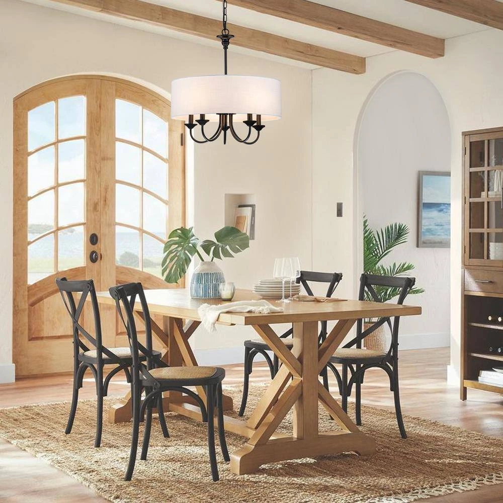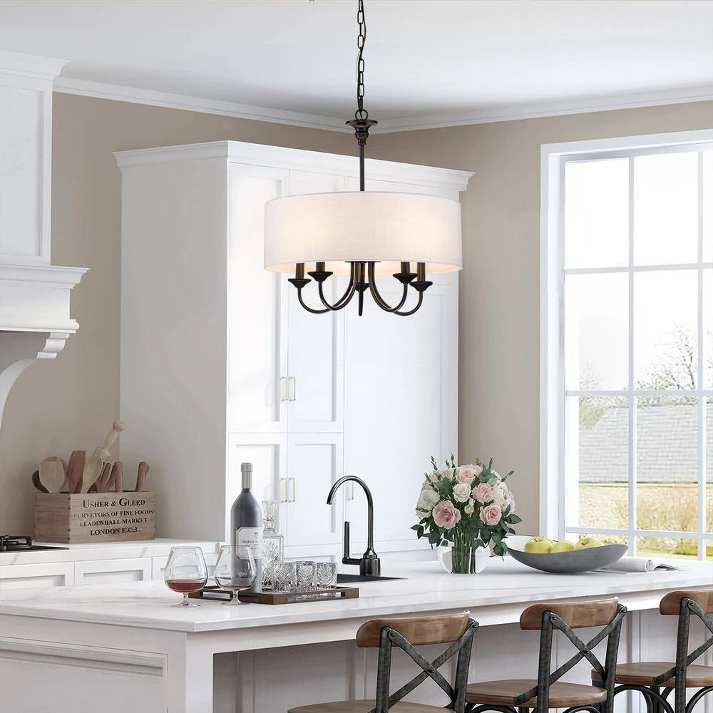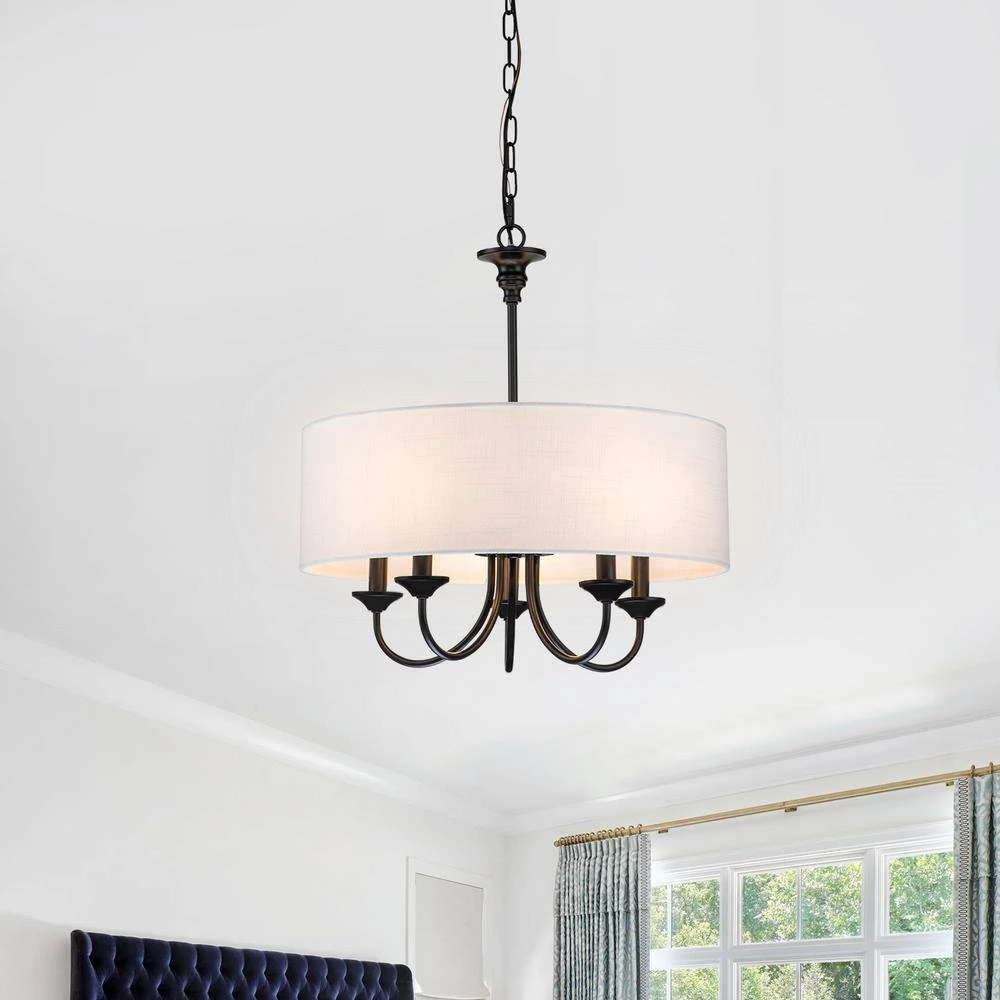 Casual with a contemporary flair, this charming chandelier is perfect over breakfast or diming table. A smart drum shade add distinction and provides pleasing illumination to your room. The 5-light sources provide plenty of vivid light while the cloth shade expertly diffuses it for casual, bright dining table conversations with family and friends. The contrast between the light shade and rich finish make this pendant the perfect transitional piece to marry dark and light tones in your home to create a bright, cozy haven.