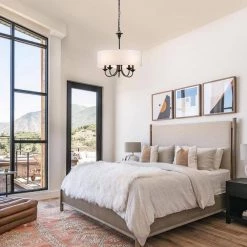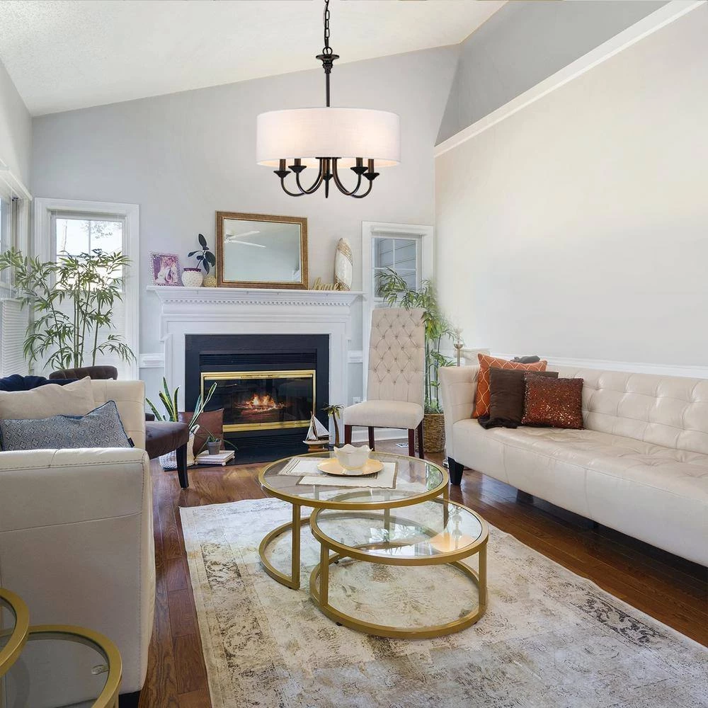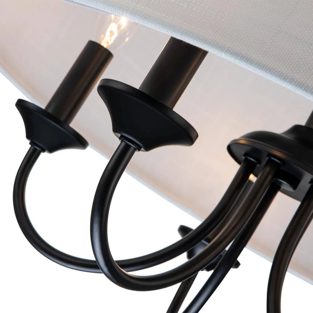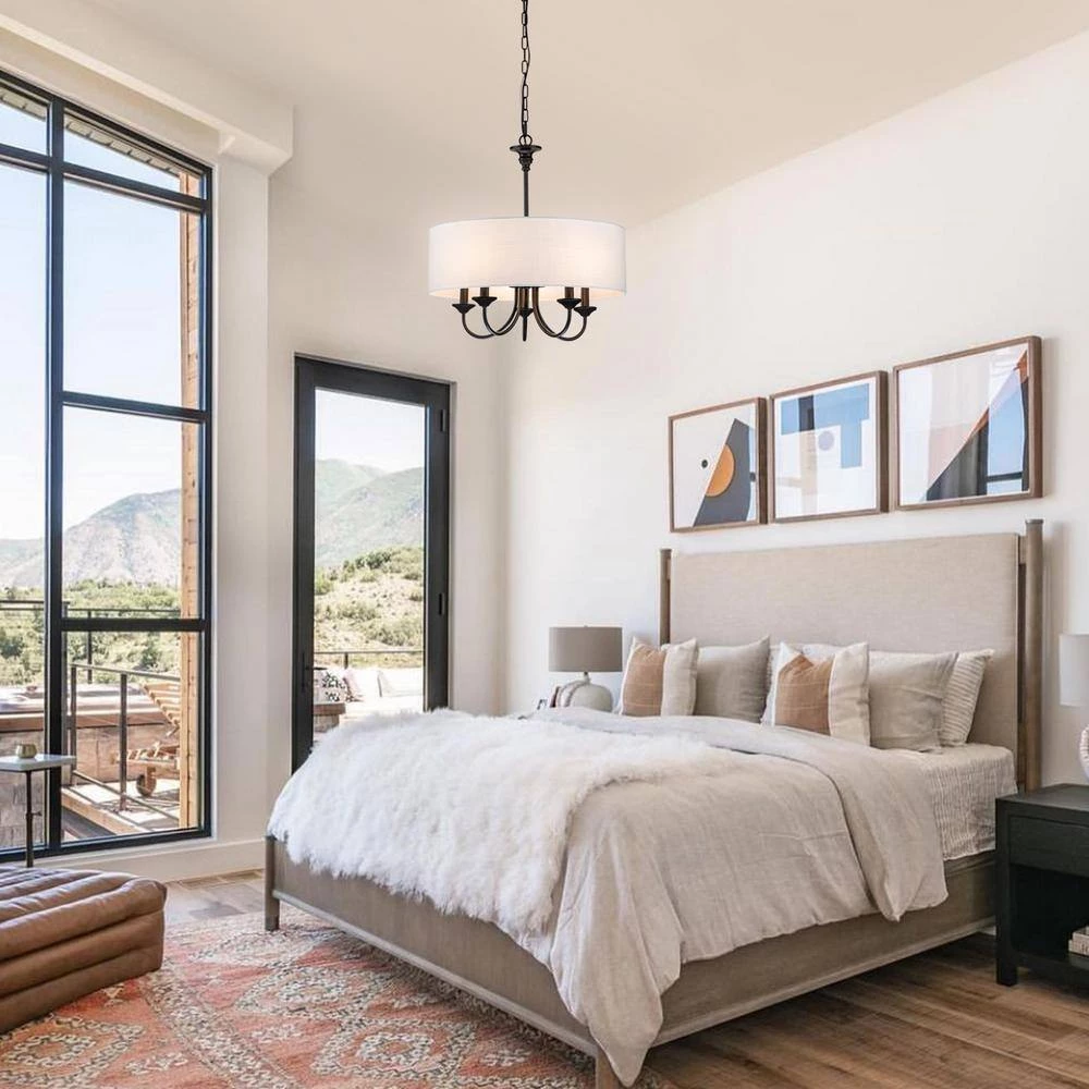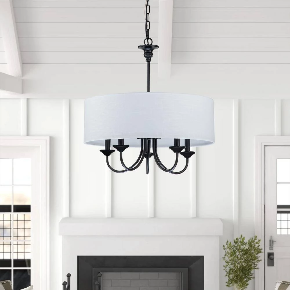 Casual with a contemporary flair, this charming chandelier is perfect over breakfast or diming table. A smart drum shade add distinction and provides pleasing illumination to your room. The 5-light sources provide plenty of vivid light while the cloth shade expertly diffuses it for casual, bright dining table conversations with family and friends. The contrast between the light shade and rich finish make this pendant the perfect transitional piece to marry dark and light tones in your home to create a bright, cozy haven.
